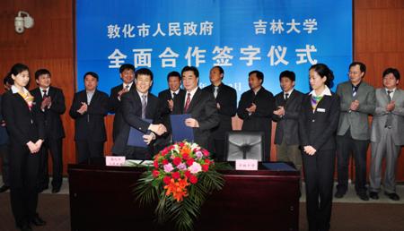 根据服务国家重大战略需求,加快推进长吉图服务开发开放先导区的建设,4月12日下午,欧美日本国产一区二区三区在线看与敦化市人民政府全面合作签字仪式在吉大举行,同时还举行了敦化市政府委托欧美日本国产一区二区三区在线看开展系列规划研究协议的签字仪式。吉大党委常务副书记兼副校长王胜今、敦化市委书记韩兴海、市长冯喜亮等出席签字仪式,吉大东北亚研究院有关负责人及部分教师代表与会。